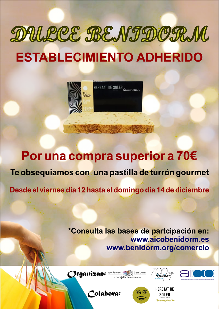 Para potenciar la navidad, desde la Concejalía de Comercio en colaboración con la Junta Directiva AICO hemos organizado la campaña "DULCE BENIDORM", con el objetivo de promocionar e impulsar los actividad en los establecimientos de comercio y de servicios.